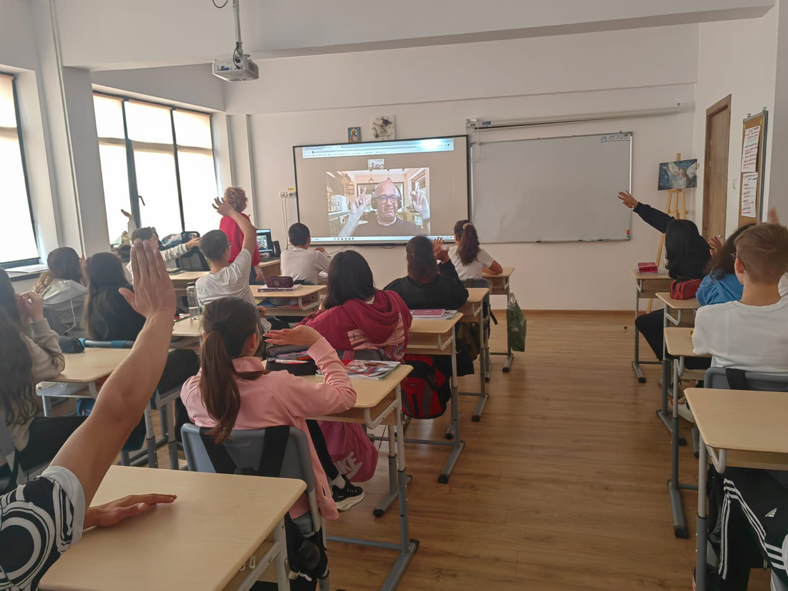 A l occasion de la journee de l Europe , l association Synergie a organise une visio conference a vec la Scoala Gymnasiale de Comanesti Roumanie