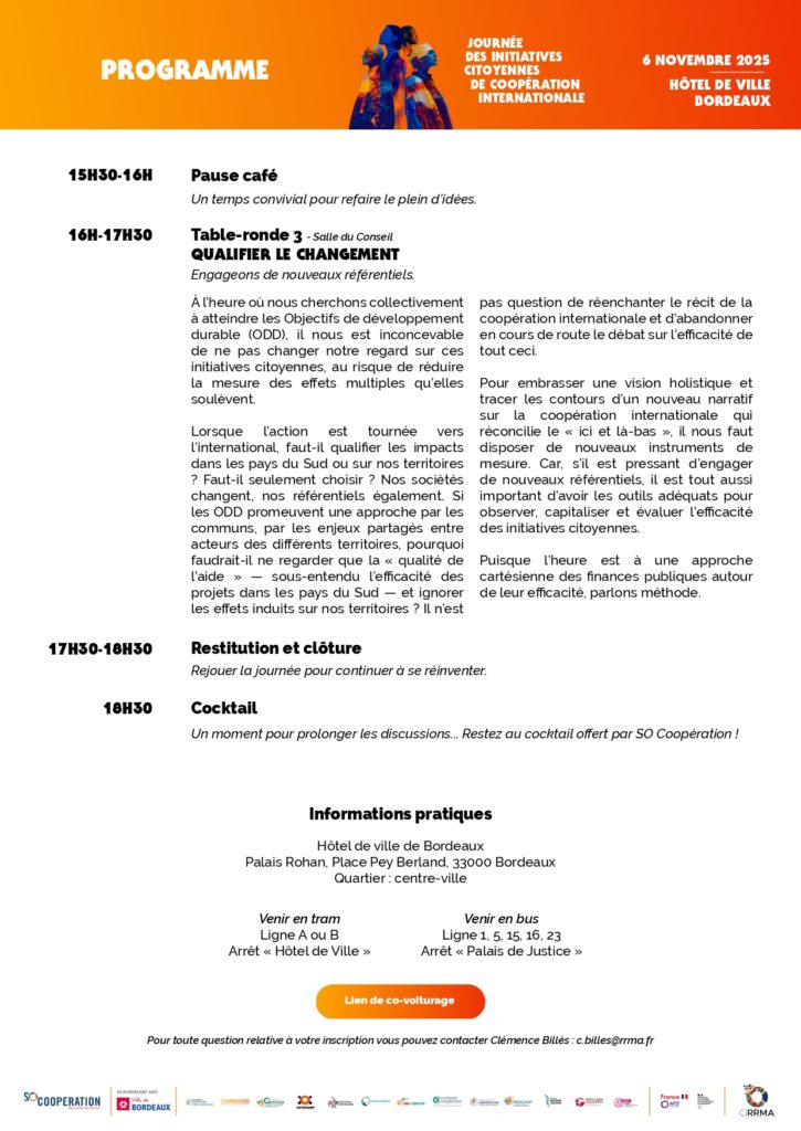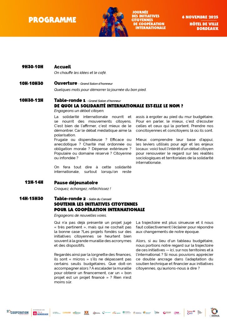 Les réseaux régionaux de la coopération internationale vous invitent à une journée dédiée aux Initiatives Citoyennes de Coopération Internationale (ICCI), le 6 novembre à l’Hôtel de ville de Bordeaux ! Cette journée sera l'occasion de mettre en lumière la richesse et la diversité des projets de coopération internationale portés par les acteurs de nos territoires.