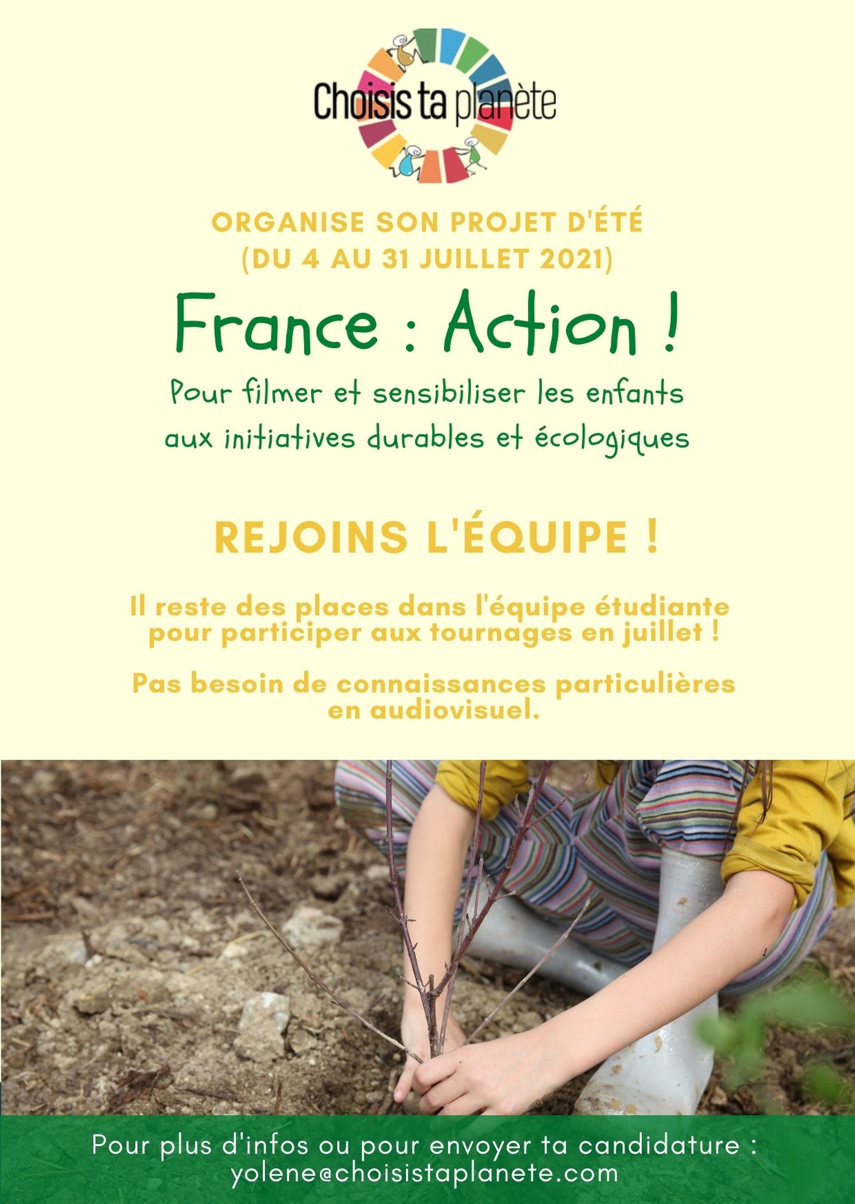 Pour plus d’infos ou pour candidater, envoyez un mail à yolene@choisistaplanete.com en expliquant ce qui vous motive dans le projet ; Nous pourrons alors convenir d’un échange