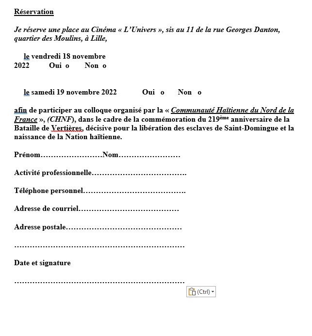 A l'occasion du 219ème anniversaire de la bataille de Vertières, l’association « Communauté Haïtienne du Nord de la France » (CHNF) organise les vendredi 18 et samedi 19 novembre prochains, au cinéma « L'Univers » – 16, rue Georges Danton, quartier des Moulins, à Lille – un colloque d'histoire sur le sujet : « Toussaint Louverture, général français, ” arbre de la liberté” », suivi d'une table ronde consacrée à la crise haïtienne actuelle, ainsi qu'une permanence de vente-dédicace de livres sur les mêmes thèmes.