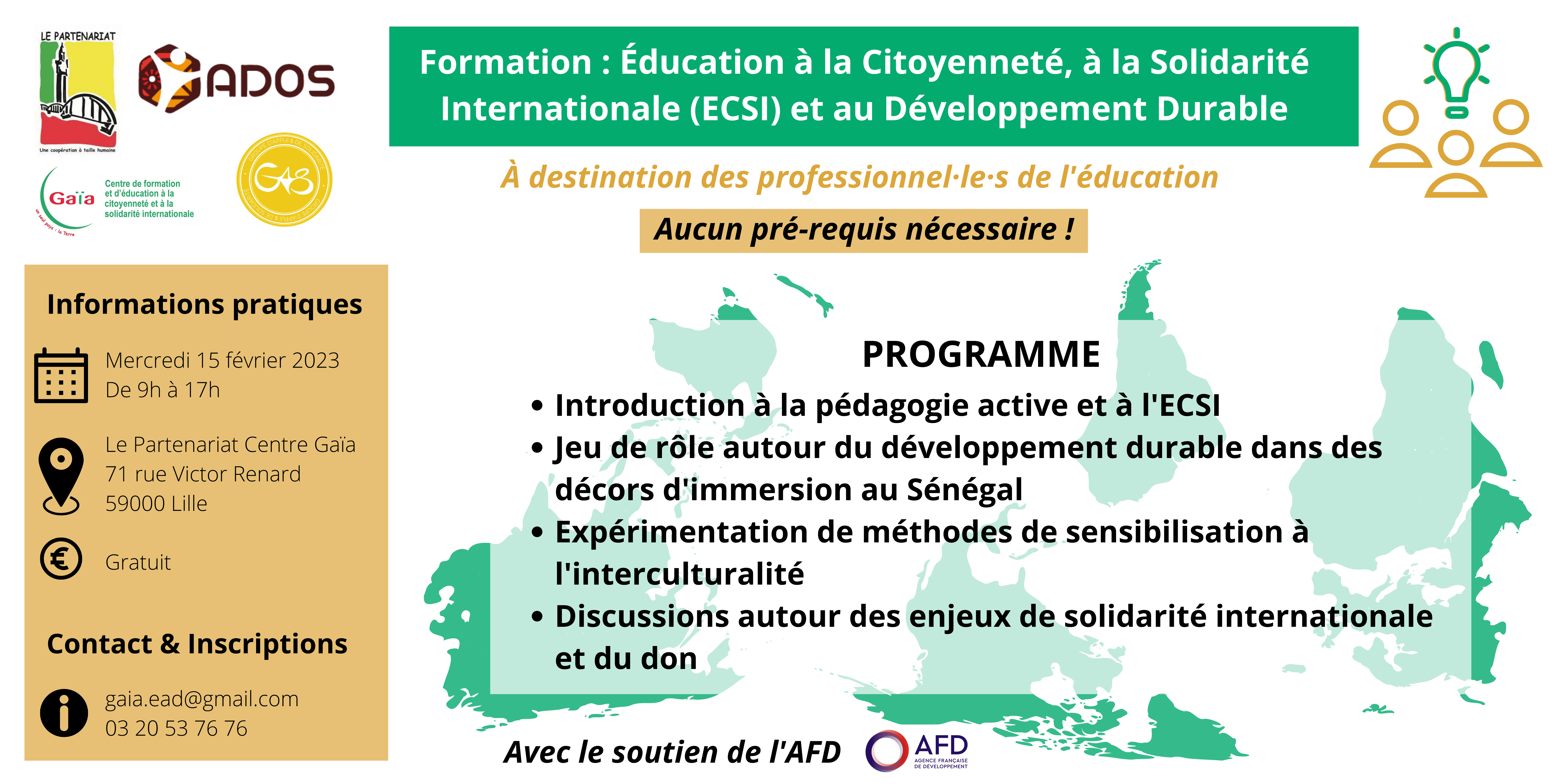 Si vous le souhaitez, cette formation est précédée d’un atelier autour des représentations sur les pays du sud, le 14 février. Plus d’infos ici (https://www.lianescooperation.org/evenement-adherent/atelier-representations-sur-les-pays-du-sud-approches-educatives-pour-les-faire-evoluer).